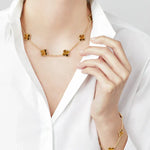 The Clover Collection Bracelet is a timeless piece featuring a delicate triple-symbol design, perfect for adding a subtle yet elegant touch to your wrist. Designed to catch every eye, it completes your look with effortless style. Crafted from high-quality stainless steel plated with 18-karat gold, our bracelets are nickel-free, hypoallergenic, and water-resistantβ€”ensuring you can wear them all day, every day, with confidence and comfort.